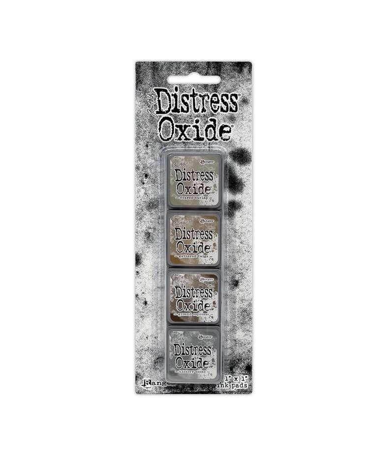 Set di 4 tamponi mini Distress Oxide, nascono dalla fusione di inchiostri a base di tintura e pigmenti idroreattivi, che creano un effetto ossidato quando vengono spruzzati con acqua.