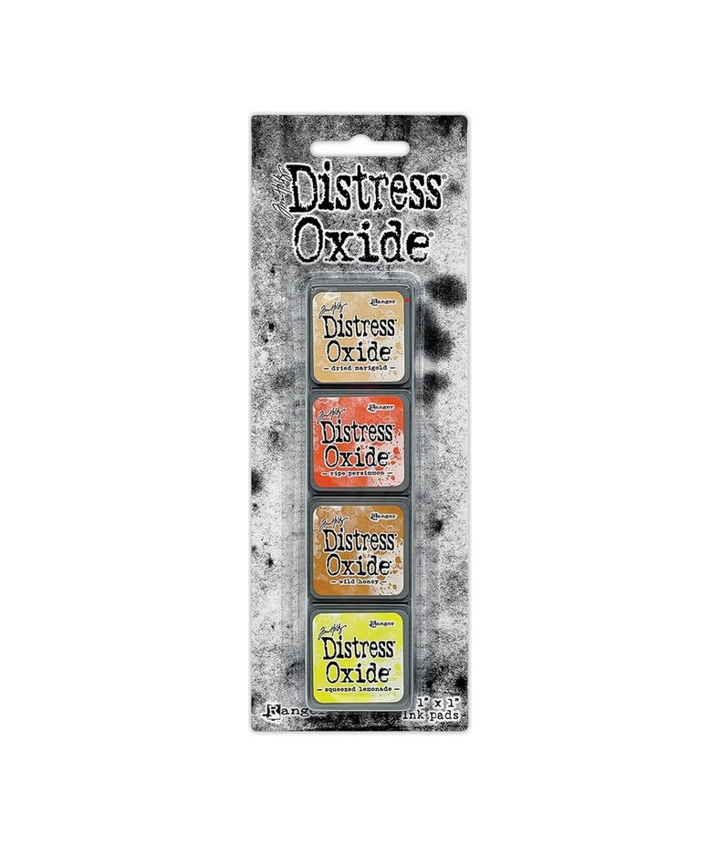 Set di 4 tamponi mini Distress Oxide, nascono dalla fusione di inchiostri a base di tintura e pigmenti idroreattivi, che creano un effetto ossidato quando vengono spruzzati con acqua.