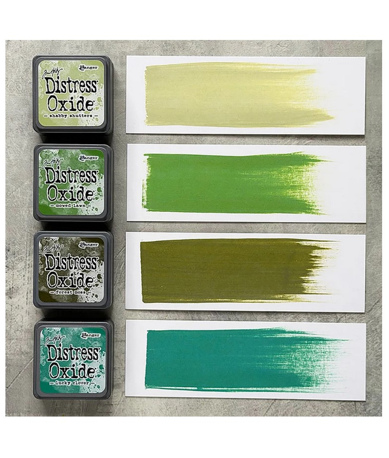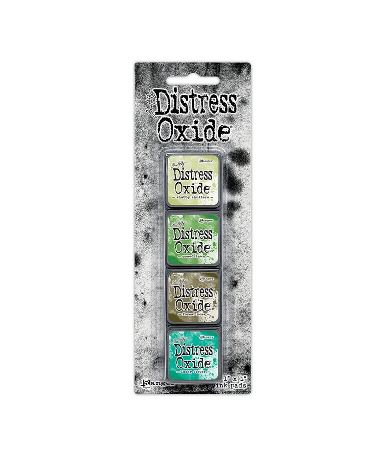 Set di 4 tamponi mini Distress Oxide, nascono dalla fusione di inchiostri a base di tintura e pigmenti idroreattivi, che creano un effetto ossidato quando vengono spruzzati con acqua.